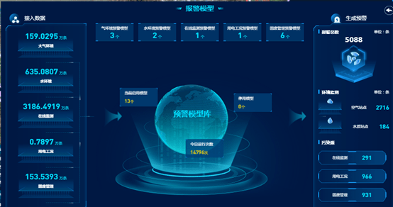 围绕污染源在线监控、企业用电工况监控、固废危废业务监控、环境质量监控共设置了14类预警模型。截至2022年1月,接入各类业务监控数据约4000万条,产生各位报警信息5000多条。