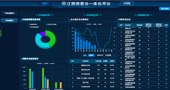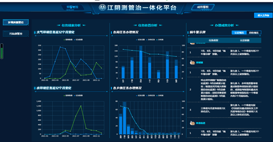 环境质量类监管工作依托江苏省污染防治攻坚平台向水利、住建、城管、交通等横向部门进行了延伸,工作开展情况纳入“测管治”一体化智能预警中心平台监管;
