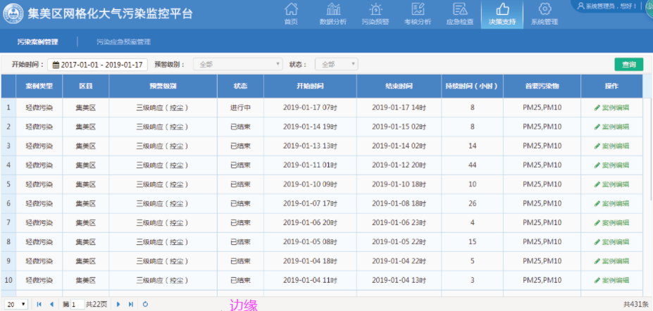 充分整合空气质量自动监测数据、污染源在线监控数据、气象数据、地图数据,提供监测数据分析、大气污染应急检查、污染案例管理等应用。