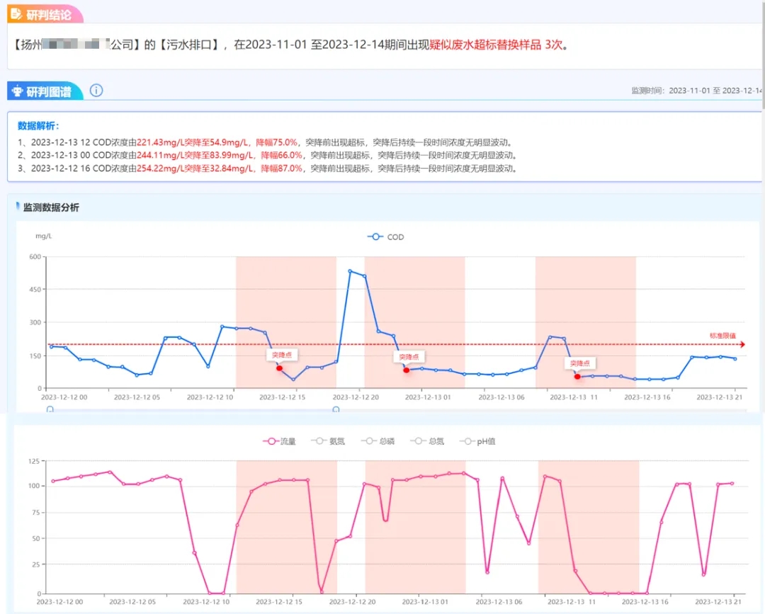 2023年11月,江苏省生态环境厅与公安厅联合成立联勤中心,强化生态环境违法打击力度。12月,通过智慧监管平台的“污染源在线监测AI模型库”,迅速识别出扬州某印染公司在12月12日至13日期间存在多次超标替换样品的嫌疑,具体表现为废水超标后数据异常波动,最终稳定在低值,且期间废水流量持续。
