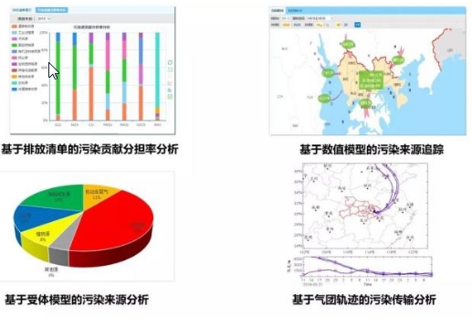 基于大气污染物排放清单、气团轨迹、源解析数据分析大气污染区域传输规律、各类源(工业源、散煤、机动车、扬尘源等)对污染物的贡献比例,进行污染成因综合研判,为制定精细化污染管控措施提供依据。