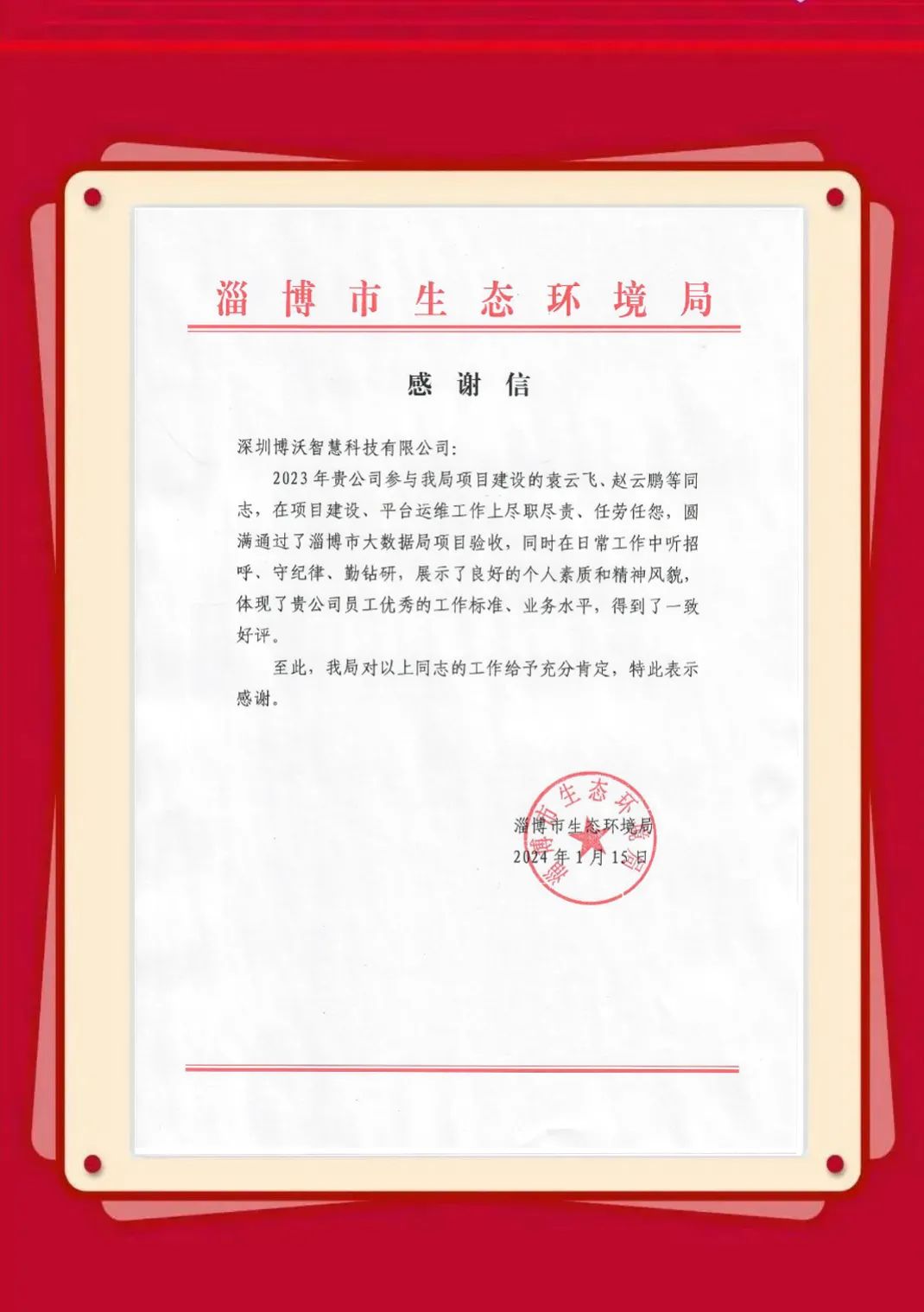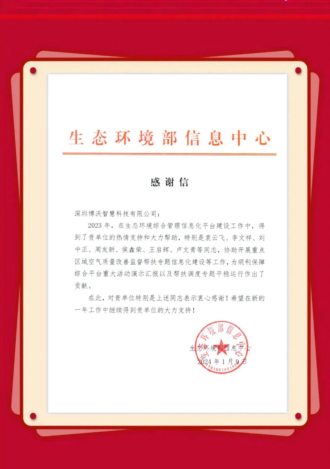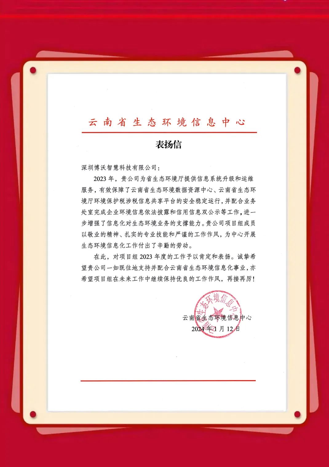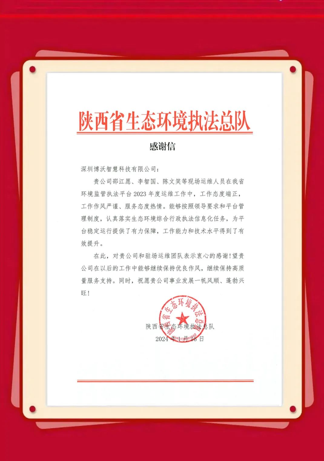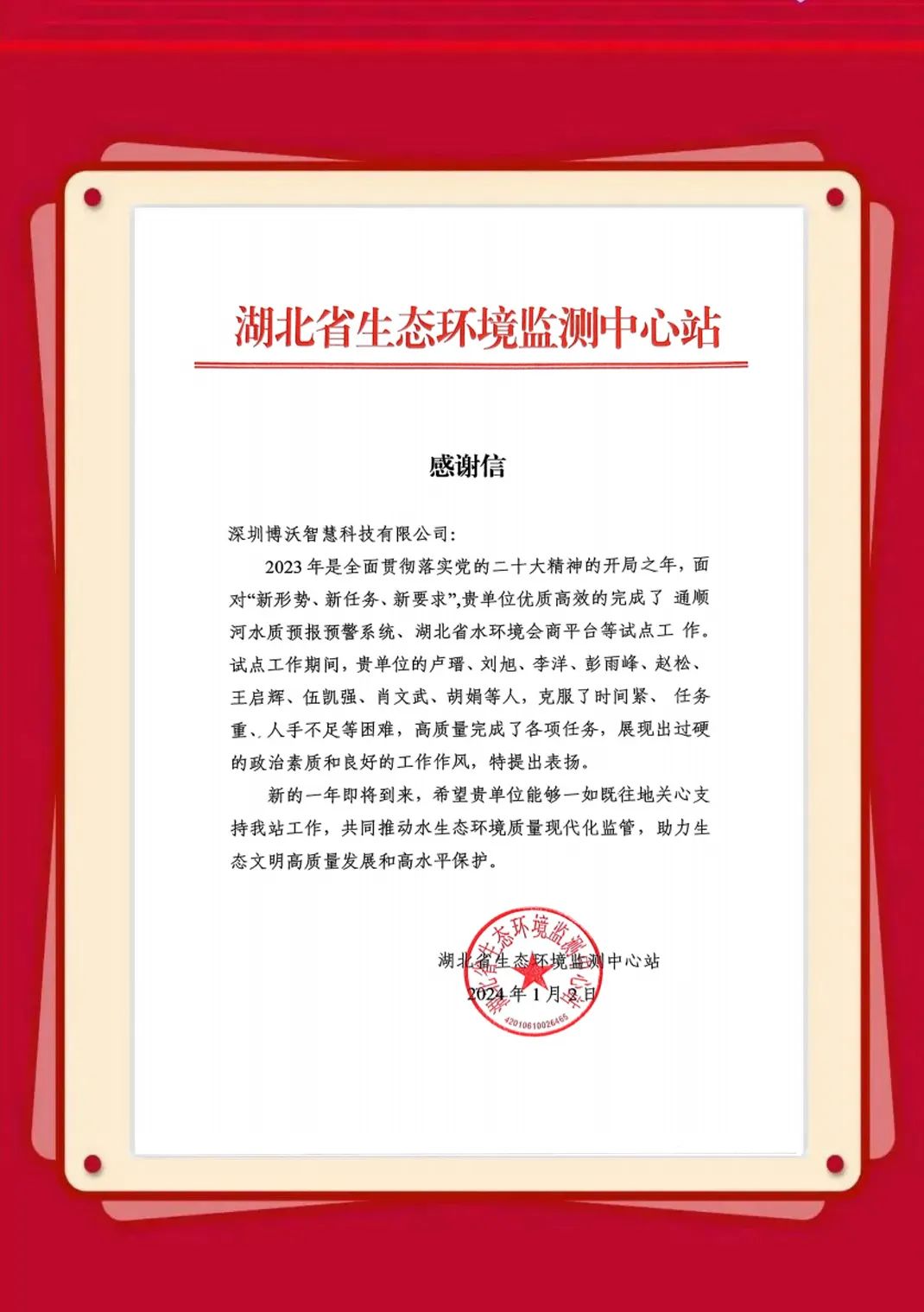 近日,博沃陆续收到生态环境部信息中心、云南省生态环境信息中心、湖北省生态环境监测中心站、陕西省生态环境执法总队、衢州市生态环境局、淄博市生态环境局、湖州市生态环境局等发来的感谢信,表彰博沃智慧员工在2023年的项目服务工作中,高质量高标准完成各项任务并获得客户认可。博沃智慧将肩负这份荣誉,持续努力,勇往直前,为打造更优、更美的生态环境贡献自己的力量。