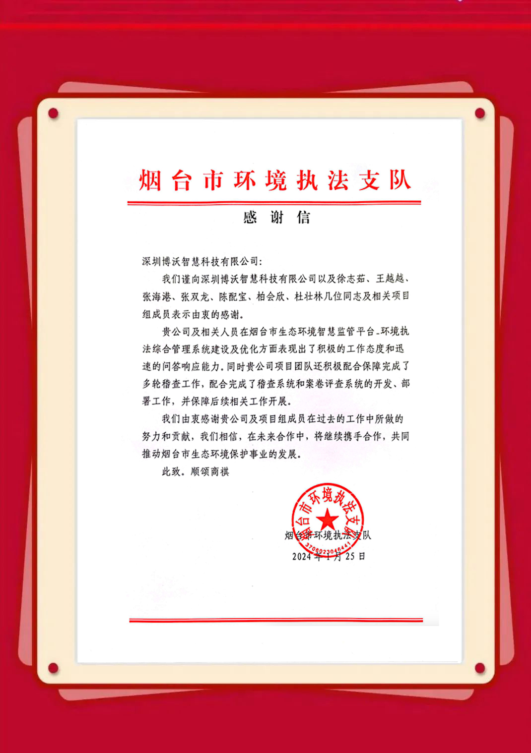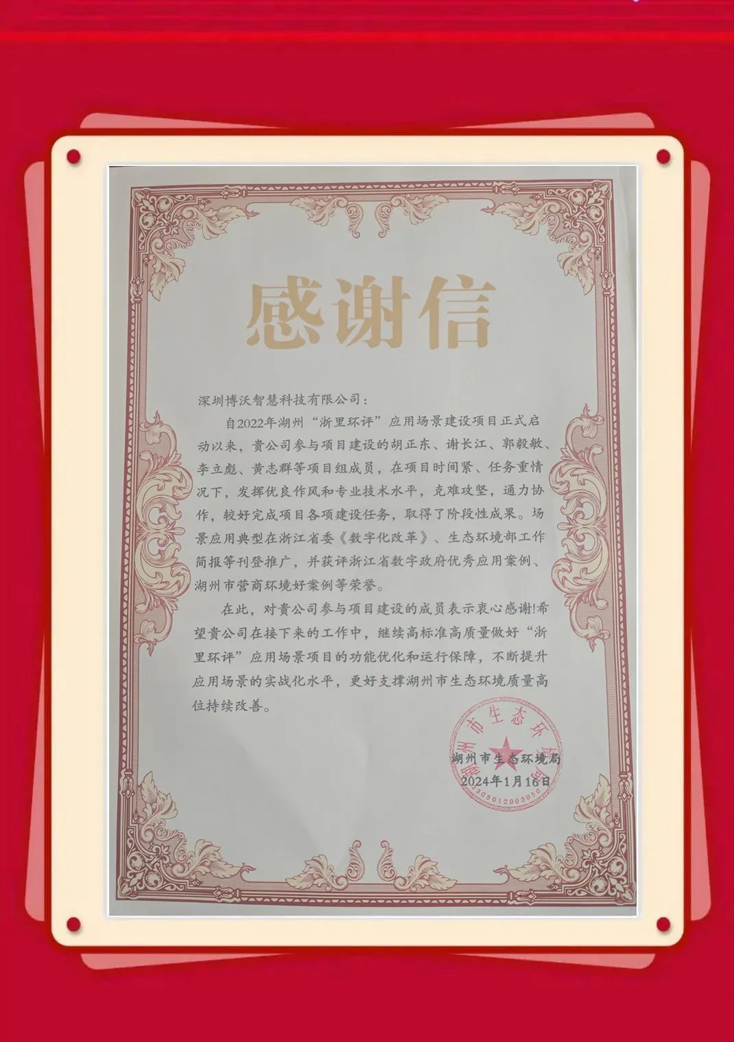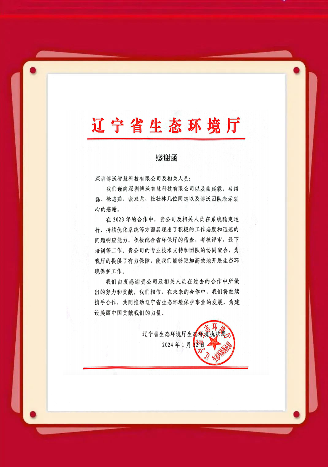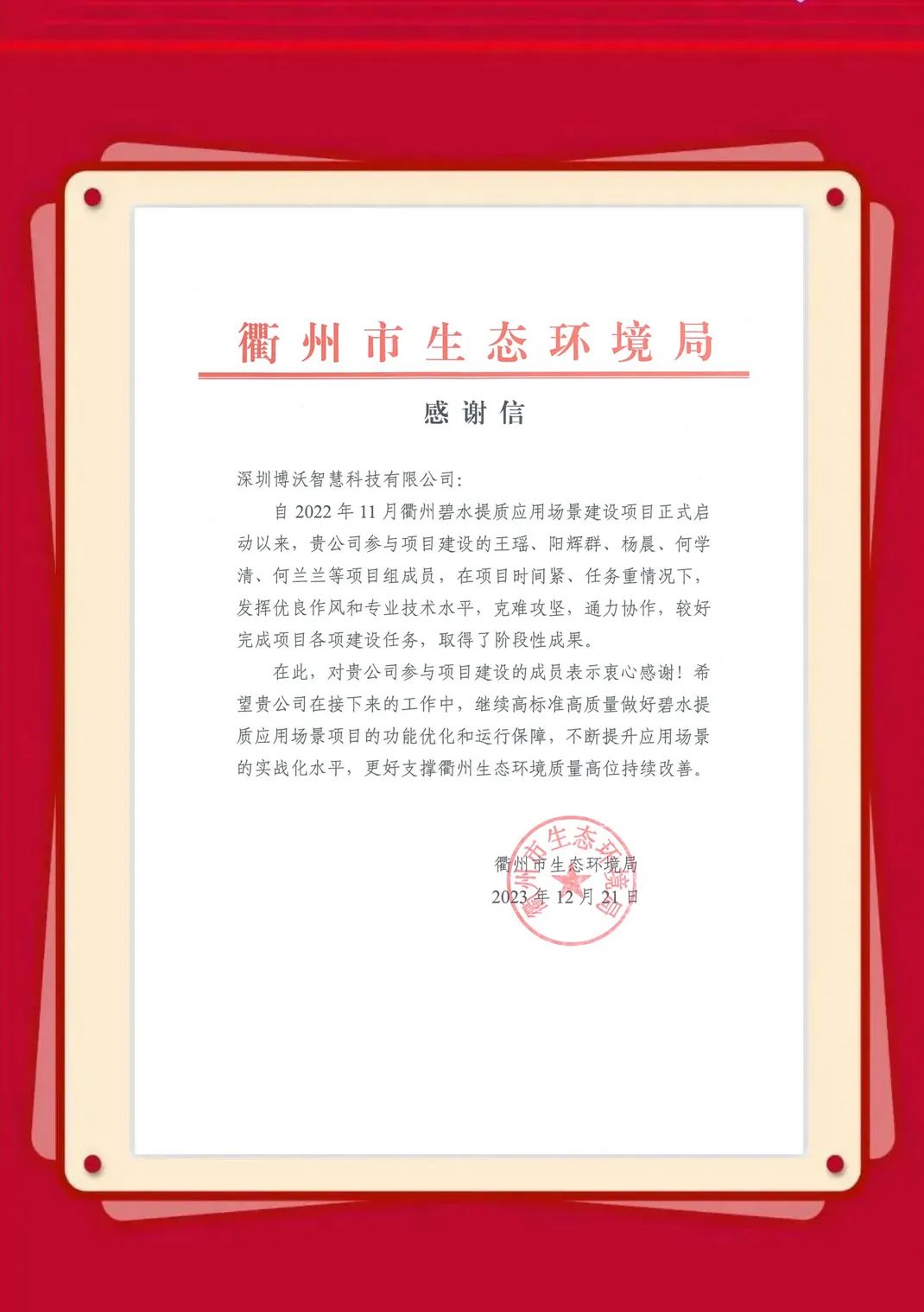 近日,博沃陆续收到生态环境部信息中心、云南省生态环境信息中心、湖北省生态环境监测中心站、陕西省生态环境执法总队、衢州市生态环境局、淄博市生态环境局、湖州市生态环境局等发来的感谢信,表彰博沃智慧员工在2023年的项目服务工作中,高质量高标准完成各项任务并获得客户认可。博沃智慧将肩负这份荣誉,持续努力,勇往直前,为打造更优、更美的生态环境贡献自己的力量。