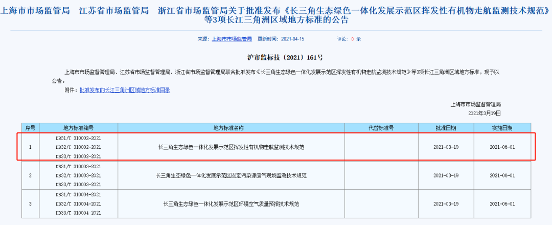 上海市市场监督管理局、江苏省市场监督管理局、浙江省市场监督管理局三省联合批准发布《长三角生态绿色一体化发展示范区挥发性有机物走航监测技术规范》(以下简称《规范》)DB31/T 310002-2021。《规范》规定了挥发性有机物走航监测的方法概述、试剂或材料、仪器和设备、监测方法、结果计算与表示、质量保证与质量控制及安全防护要求。明确了示范区范围覆盖上海市青浦区、江苏省苏州市吴江区和浙江省嘉兴市嘉善县。