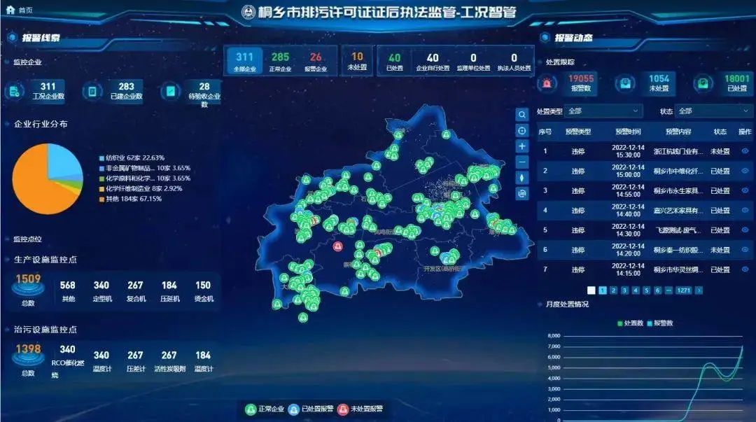 得益于智治管理,企业配备的在线监测和工况监控设备,犹如千里眼和顺风耳,能第一时间发现问题、发出预警并督促解决问题。一张网,管住了桐乡市1万多家排污企业的“健康状况”。