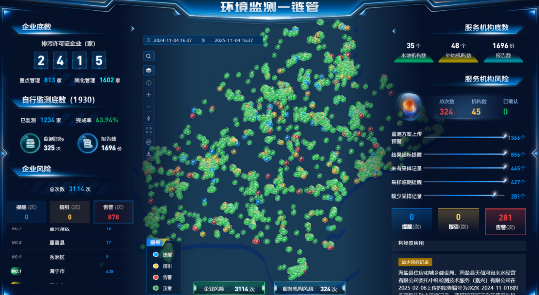 截至目前,平台已实现嘉兴本地34家监测机构100%入驻,备案外地机构20余家,累计覆盖2400余家持证排污企业。